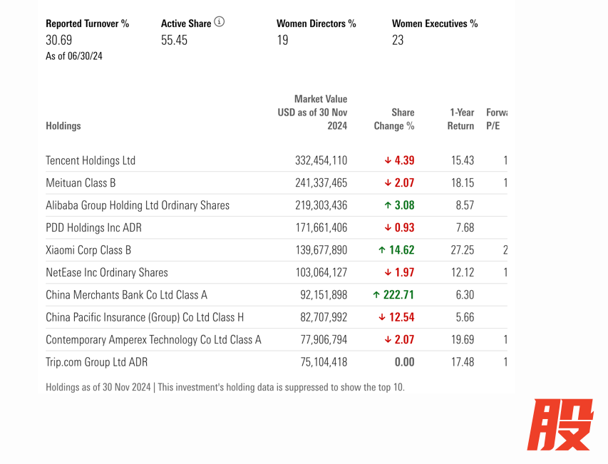 晨星数据显示,摩根资产管理旗下投资中国的基金JPM China A (acc) USD,最新管理规模为33亿美元。2024年11月,该基金大举加仓招商银行。截至11月底,其前十大股票持仓为腾讯、美团、阿里巴巴、拼多多、小米集团、网易、招商银行、中国太保、宁德时代、携程集团,当月对招商银行的加仓幅度高达222.71%,加仓后约持有9215万美元的招商银行A股股份。